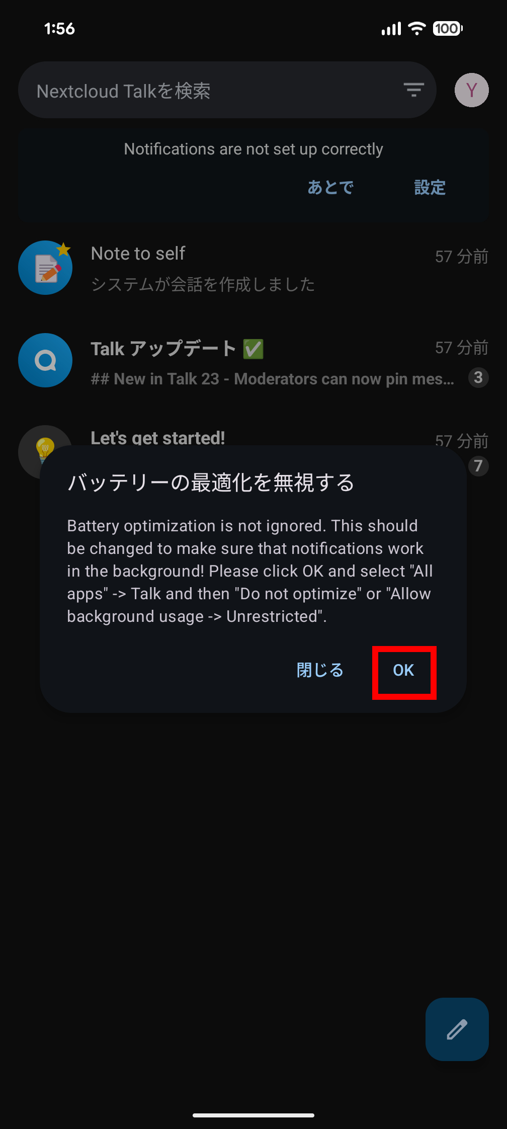 「アカウントに接続しました」と表示されたら「Nextcloud Talk」アプリに切り替えます